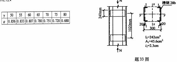 33.如图所示轴心受压缀板式格构柱,轴向压力N=1460kN,柱高7.2m,两端铰接,钢材的强度设计值f=215N/mm2,两个柱肢截面面积为A=2×45.6=91.2cm2,缀板间距、单肢截面几何特征已在图中注明.试验算此柱绕虚轴的稳定性.