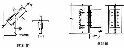31.如图所示双角钢与节点板采用侧面角焊缝相连,N=450kN,角钢为2L100×10,节点板厚度t=8mm,钢材为Q235B,手工焊,焊条为E43系列,ffw=160N/m2,试确定所需焊脚尺寸及焊缝长度.(提示:K1=0.7,K2=0.3)