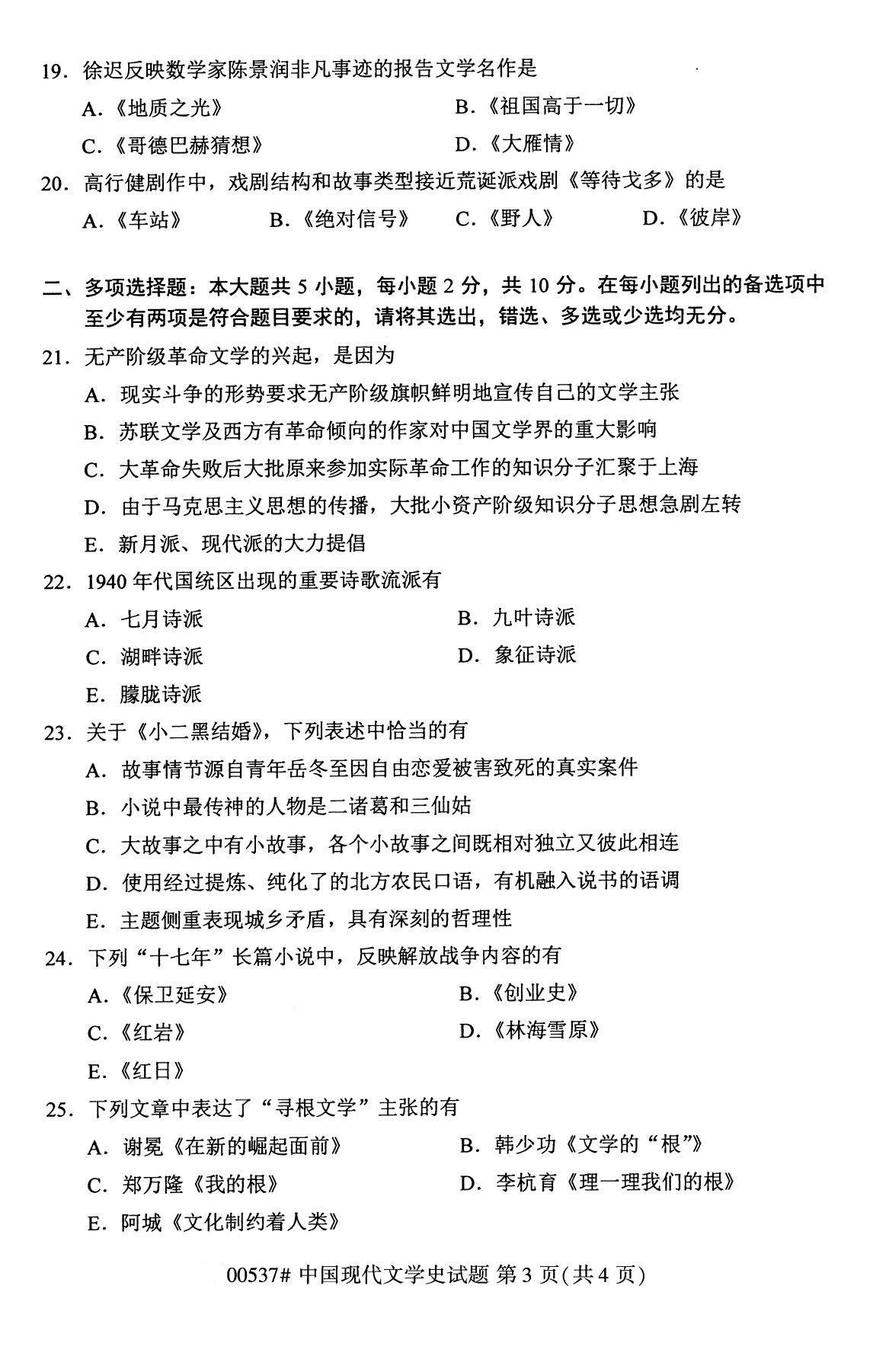 江西省2020年8月自学考试本科00537中国现代文学史真题