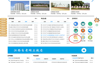 1、进入江西自考网,下拉至网页中部,选择红色圈圈内的成绩查询,是一个放大镜里面一顶学士帽的图标: